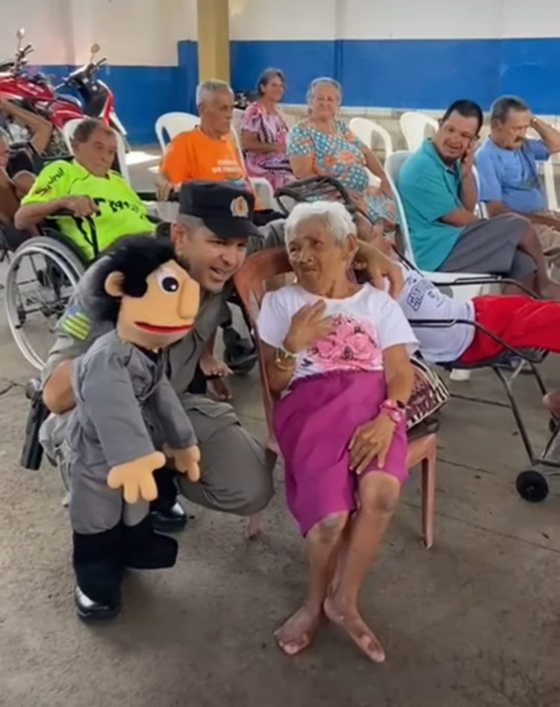 Policiais militares levam alegria a idosos com apresentação do Boneco Stive em Itapuranga
